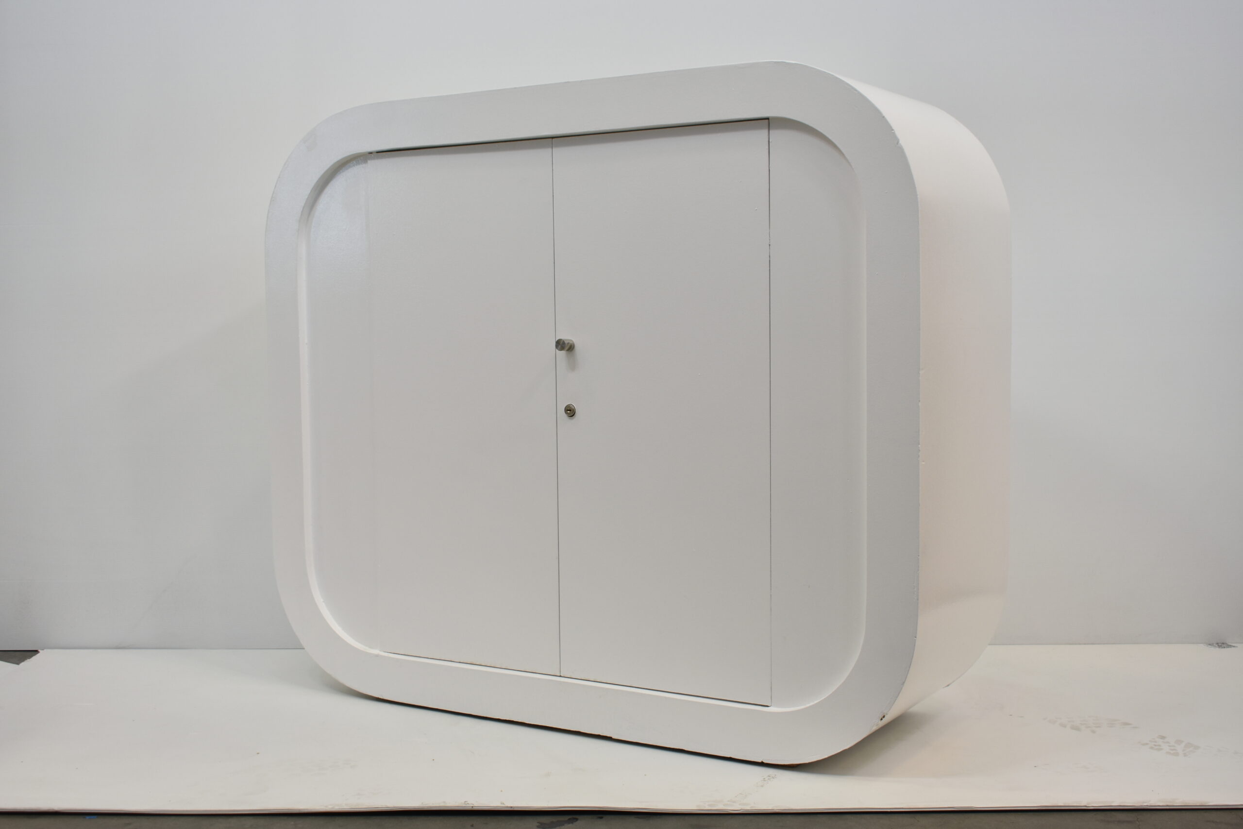 Balcão branco em madeira com prateleira, portas e fechadura.